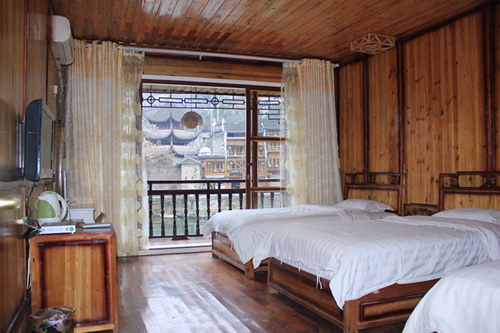 古樸的客房內(nèi),超大陽臺全景落地窗,是您欣賞沱江風(fēng)光帶首選客棧,兩座百年四合院內(nèi)小橋流水,假山錦鯉,一百三十平米休閑花園別具情調(diào)。紅酒加咖啡的大堂吧、彩色精致的情調(diào)房、古典高雅的臨江觀景房以及大型公共觀景平臺,龍閣的點點滴滴都透著出古城的神韻和幽靜,走進龍閣客棧,給您一個完美的鳳凰古城沱江全景!