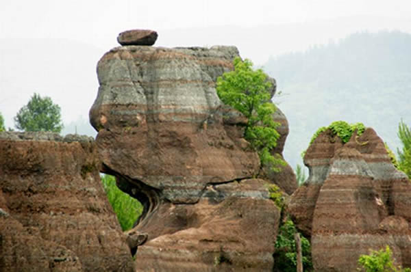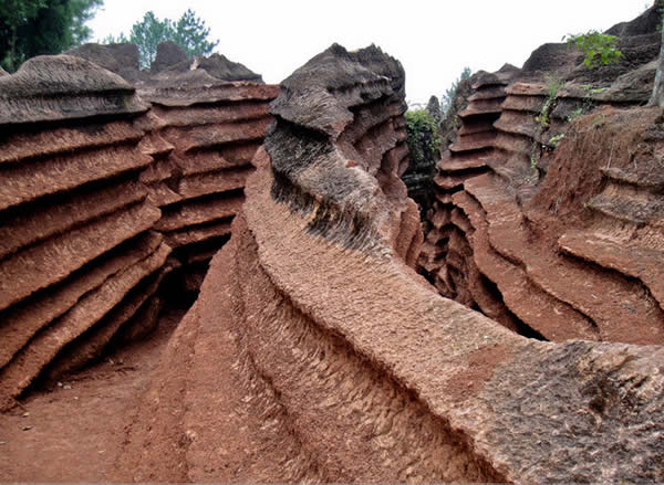 紅石林 告別船工后一切便突然安靜下來(lái),過(guò)山谷的小路沒(méi)有人家,偶爾傳來(lái)幾聲清脆的鳥(niǎo)叫。穿過(guò)幾座隘口,峰回路轉(zhuǎn)后“石林”漸漸露臉,石頭的顏色是由灰白到棕紅,變幻而又使人聯(lián)想。間或一棵參天大樹(shù),或是綠竹三兩棵,則又是另一番景致了。于高于低、于肥于瘦的石林,于石于樹(shù)、于濃于淡的色彩,顯得雄奇又雋秀,并透露出一種清靈飄逸。 這些石柱不但顏色各異,而且大小不等。有的高達(dá)七、八米,而有些則像半埋于地下的巨獸骨架。一位村民告訴記者,現(xiàn)在石林沒(méi)有以前壯觀,都長(zhǎng)渣子(灌木)了。原因是由于山頂樹(shù)木減少,雨水將泥土帶下山,很多石頭都被埋在土下,后來(lái)這些地方都開(kāi)墾了農(nóng)田,石林也被永久覆蓋。 由于泥土覆蓋,石林被切割成一個(gè)個(gè)小區(qū)域,有些隱蔽在果林中,而有些則像突然從天而降,散落田間。