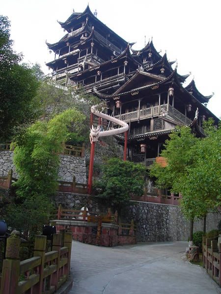 九重天 九重天世襲堂是土家風(fēng)情園的精華和靈魂所在。該建筑由土家民間藝人李宏進(jìn)設(shè)計(jì),依80度陡坡而建,高48米,共9重12層,整個(gè)樓房全部用木栓連接,沒有一顆鐵釘,堪稱土家族建筑史上的奇跡。2002年9 月22日,九重天吊腳樓被載入世界吉尼斯世界紀(jì)錄,認(rèn)定其為目前中國最大、最高、最完美的木質(zhì)結(jié)構(gòu)吊腳樓。2001年4月6日,朱镕基總理視察土家風(fēng)情園時(shí),對九重天贊不絕口:“一批民間匠人能造出這樣輝煌的吊腳樓,而且還解決了力學(xué)的問題,真是不簡單!鼻迦A大學(xué)著名建筑學(xué)家何重義先生說:“張家界土家風(fēng)情園完全可以和蘇州的園林相媲美。特別是九重天世襲堂,猶如玉宇瓊閣,令人神往!”古人說,天有九野,地有九州,土有九山,山有九寨。古人又把九重叫做天,說天有九重,最上一重是上帝和君主居住的地方,所以我們叫它“九重天”。