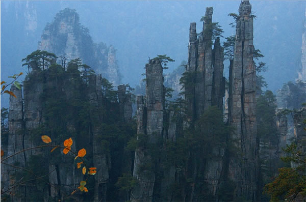 從仙人橋去老屋場,但見深谷里密密麻麻羅列上百座石峰,活像一群威武雄壯的將士列隊聽令,相傳這是向王天子的神兵在聚會。神話雖不可靠,但石峰如此集中壯觀,在武陵源也屬罕見。我想引用一位美術(shù)大師的話:“豈有此理,莫名其妙,說也不信,到此方知”。不看神兵聚會,怎知石峰成林。