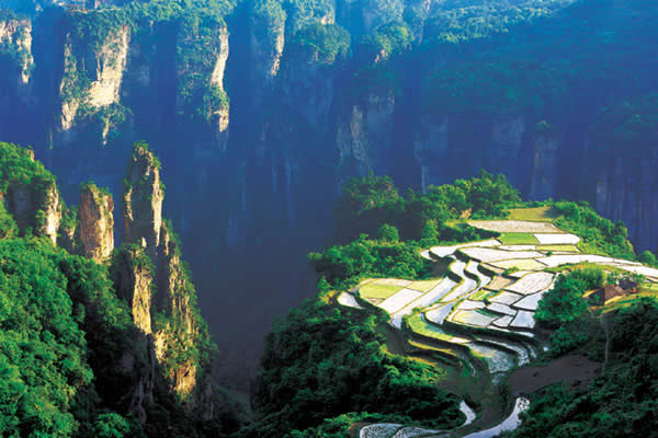 空中田園坐落在天子山莊右側(cè)經(jīng)老虎口、情人路方向兩公里處的土家寨旁,海拔1000余米。它的下面是萬丈深淵的幽 谷,幽谷上有高達數(shù)百米的懸崖峭壁,峭壁上端是一塊有3公頃大的斜坡梯形良田。田園三方峰巒疊翠,林木參天,白云繚繞,活像一幅氣勢磅礴的山水畫。登上“空中田園”。清風(fēng)拂袖,云霧裹身,如臨仙境,使人有青峰鳴翠鳥,高山響流泉,身在田園里,如上彩云間”之感。