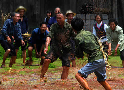 插秧活動的最后一天,叫做“關(guān)秧門”。一丘田里,聚集了很多幫忙插秧的人,大家心里都憋著一股勁,看誰秧插得最快。速度慢人往往會被插得快的人圍住,最后關(guān)在秧田中間出不來,這叫“關(guān)豬籠”。這時候,速度快的人就會走上田埂,抓起稀泥團朝被關(guān)了豬籠的人扔去,也有專門砸主人一身稀泥的,岸上也有人澆水。主人身上被砸的稀泥越多,主人越高興。在關(guān)秧門的最后時刻,人們會在田野里上演一場你追我趕的游戲,土家人把它叫做“糊倉”。在“糊倉”的過程中,誰也不會記仇,大家你追我趕,場面極其熱鬧。
