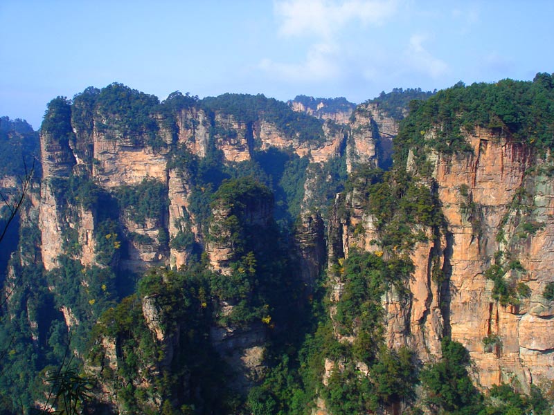 與袁家界后花園觀景臺(tái)遙遙相對(duì)。海拔949米,相對(duì)高度400多米,頂部面積3公頃。因野山羊多而得名。整座石峰,東、西、南三面皆絕壁,唯北面一徑可上。頂部為一平緩的狹長(zhǎng)石梁,長(zhǎng)近500米,寬20~30米,呈東西向,布滿原始次生林。向西伸出三道小石梁,長(zhǎng)10~20米,寬2~3米,前沿皆是高危奇絕的凌空觀景臺(tái)。立臺(tái)上,仿佛置身云端,鳥(niǎo)瞰金鞭溪、舍刀溝,宛如絲帶隱現(xiàn)于峰谷綠叢中。放眼四圍,千百座石峰,環(huán)列足下,浩浩蕩蕩,如劍朝森列,如將軍布陣,如古塔競(jìng)姿。西面7對(duì)石峰似七對(duì)情侶,男俯女仰,對(duì)面而立。民國(guó)年間,此寨是土匪巢穴,留有卡門、殘堡、斷壕、屋場(chǎng)、水井、破臼、磨坊等殘跡。 |