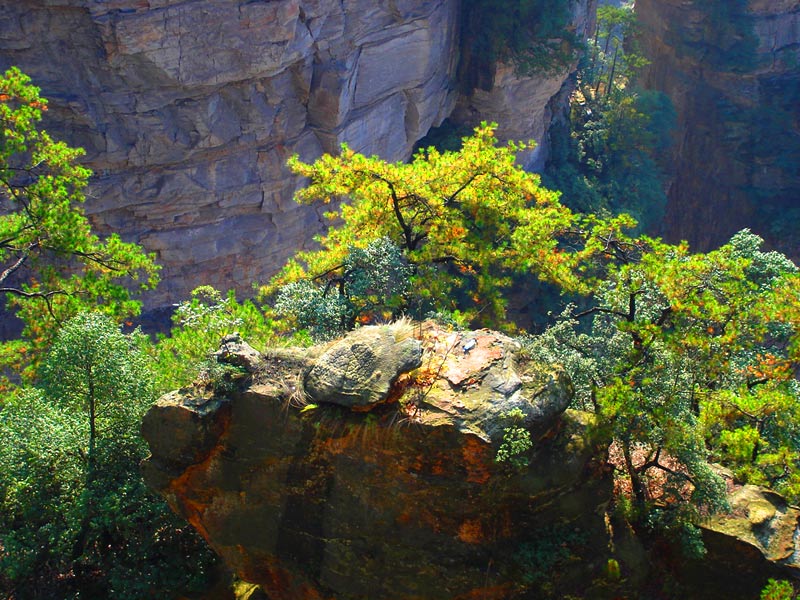 在袁家界中坪與下坪交接處,有一藏而不露的景觀曰:“后花園。”游人在崖間翠竹叢林中向下穿行、突然被一面石壁擋住。正凝無(wú)路、卻見(jiàn)絕壁拐彎處,洞開(kāi)一若滿月?tīng)畎资瘓@內(nèi)、穿門而過(guò), 眼前突現(xiàn)數(shù)十座奇峰參差聳立于墨綠深澗之中。