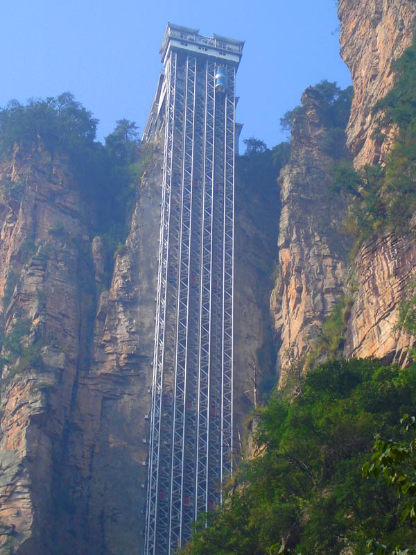 百龍?zhí)焯,垂直高?35米,運(yùn)行高度326米,由154米山體內(nèi)堅(jiān)井和172米貼山鋼結(jié)構(gòu)井架等組成,采用三臺(tái)雙層全暴露觀光電梯并列分體運(yùn)行,每臺(tái)次載客50人次,運(yùn)行速度3米/秒,三臺(tái)同時(shí)運(yùn)行每小時(shí)往返量達(dá)4000人次。百龍?zhí)焯莸男藿▽?shí)現(xiàn)“山上游,山下住”的目標(biāo),提供了交通保障,將袁家界天下第一橋、迷魂臺(tái)、天懸白練以及烏龍寨、楊家界等絕世美景從幕后推向了前臺(tái),并將天子山、袁家界、金鞭溪等精品旅游線路連為一體,解決了多年困擾景區(qū)的交通瓶頸問(wèn)題。