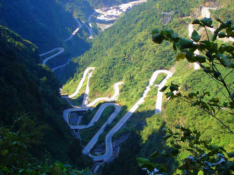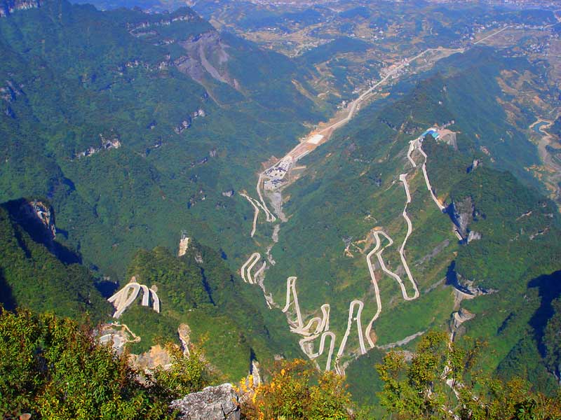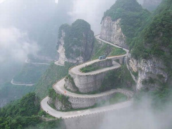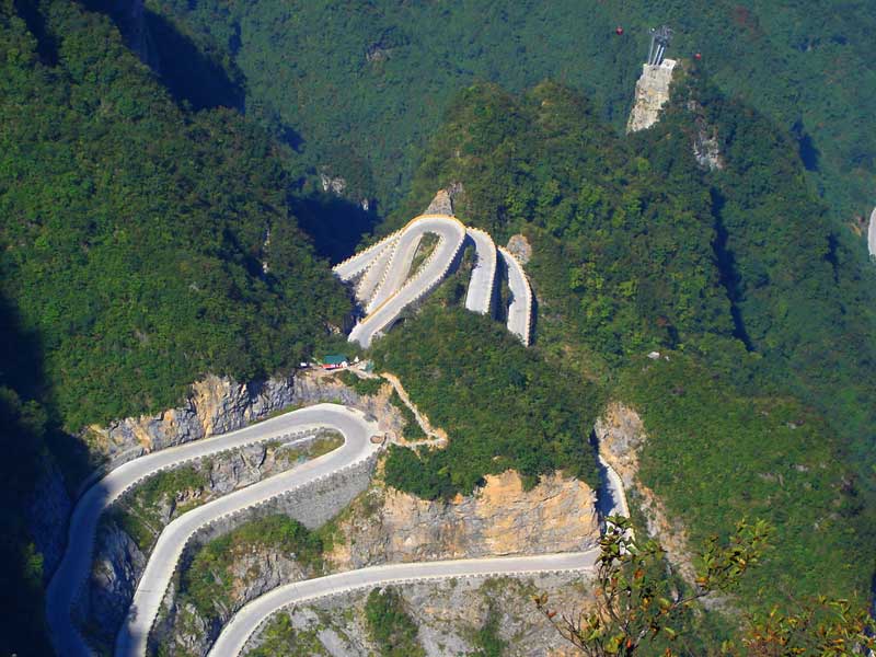 張家界天門山盤山公路有"通天大道"之稱,盤山公路全長10.77公里,海拔從200米急劇提升到1300米,大道兩側(cè)絕壁千仞,空谷幽深,共計(jì)99個(gè)彎,180度急彎此消彼長,似玉帶環(huán)繞,彎彎緊連,層層迭起,被譽(yù)為“天下第一公路奇觀”。