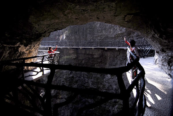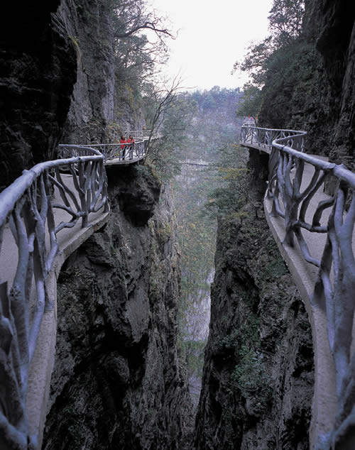 據(jù)施工人員介紹,此條棧道也是他們所修棧道中施工最難,最險(xiǎn)峻的一條。如果您還覺得不夠刺激的話,在棧道的完結(jié)處的兩個(gè)懸崖之間有一條長(zhǎng)160米的懸索吊橋,同時(shí),在海拔最高點(diǎn)還有一個(gè)挑戰(zhàn)心里極限的玻璃站臺(tái),在這里,如果你能挺直腰板伸開雙臂,那么,您就是真正的勇士了。