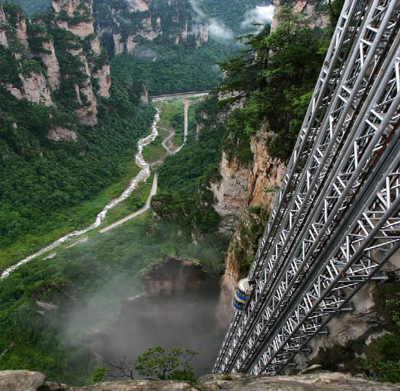 百龍電梯圖片 百龍?zhí)焯輾鈩?shì)恢宏,垂直高差335米,運(yùn)行高度326米,由154米山體內(nèi)堅(jiān)井和172米貼山鋼結(jié)構(gòu)井架等組成,采用三臺(tái)雙層全暴露觀光電梯并列分體運(yùn)行,每臺(tái)次載客50人次,運(yùn)行速度3米/秒,三臺(tái)同時(shí)運(yùn)行每小時(shí)往返量達(dá)4000人次。百龍?zhí)焯莸男藿▽?shí)現(xiàn)“山上游,山下住”的目標(biāo),提供了交通保障,將袁家界天下第一橋、迷魂臺(tái)、天懸白練以及烏龍寨、楊家界等絕世美景從幕后推向了前臺(tái),并將天子山、袁家界、金鞭溪等精品旅游線路連為一體,解決了多年困擾景區(qū)的交通瓶頸問題。