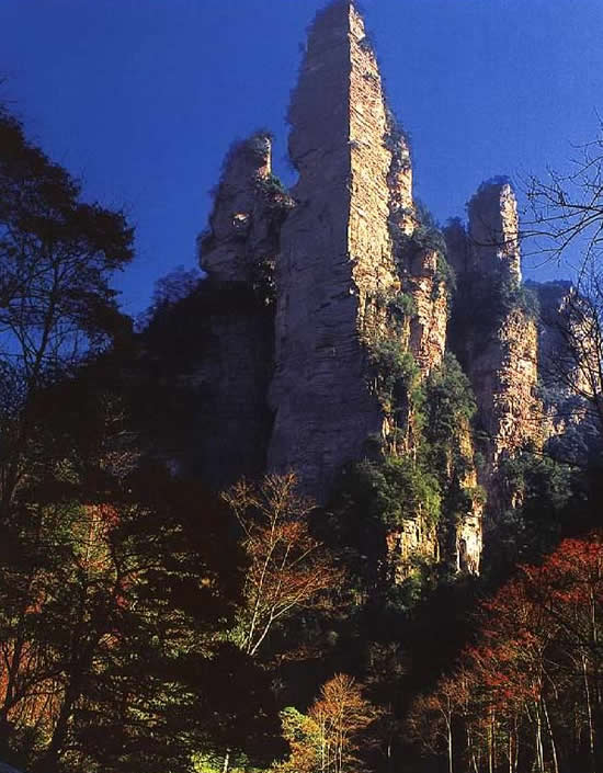 | 金鞭巖:過(guò)“閨門(mén)峰”沿溪而下約500米,有一座高約400米,孤標(biāo)直立,雄奇挺拔的奇峰,名金鞭巖。金鞭巖是武陵源著名景點(diǎn),峰體上細(xì)下粗,四棱分明。棱面布滿(mǎn)節(jié)理橫紋,形成鞭節(jié),渾如一根豎插大地的長(zhǎng)鞭。每當(dāng)夕陽(yáng)晚照,鞭身涂金,熠熠閃光,瑰麗奪目,構(gòu)成一幅奇特壯美的“夕陽(yáng)金鞭圖”。