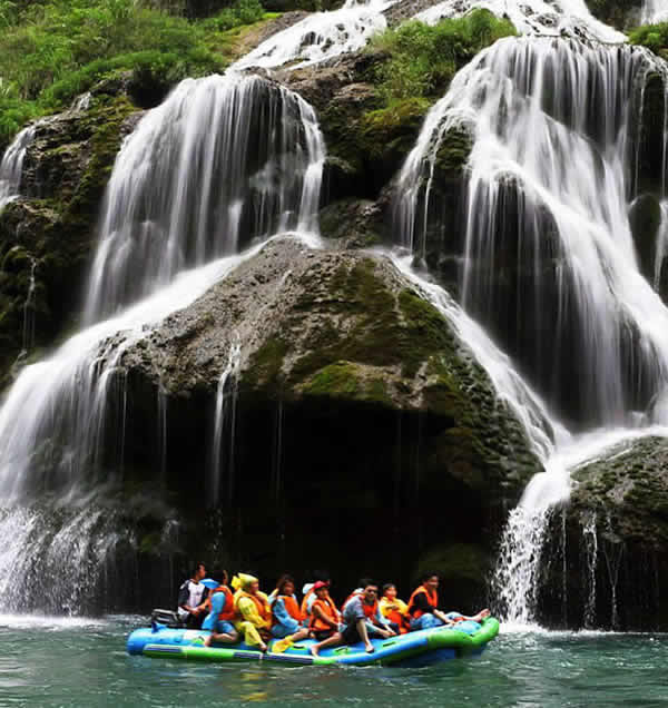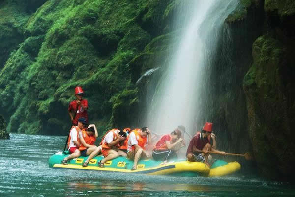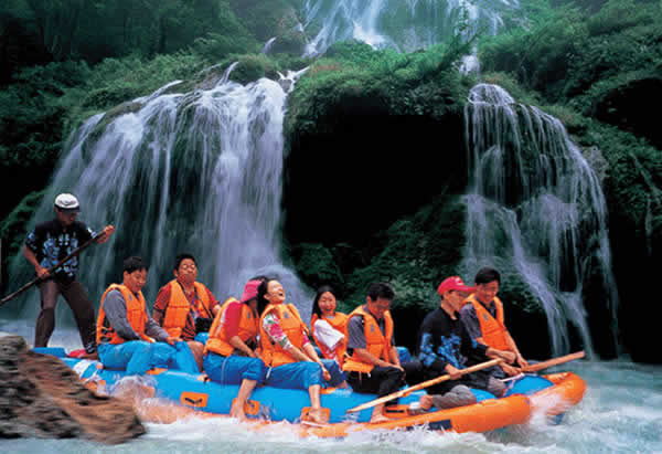 茅巖河漂流 茅巖河沿途的眾多飛瀑流泉中,尤以水洞瀑布最為壯觀迷人。瀑布從70多米高的峭壁瀉出,漫流過(guò)三級(jí)凸凹不平的峭壁,形成長(zhǎng)短不一的三疊,瀑水在每級(jí)的石臺(tái)上漫過(guò)突兀出來(lái)的溝溝槽槽飛流而下,或?qū)捜玢y河,或窄似白練,或似垂掛的水簾,或似串串銀珠,飛落茅巖河中,撞擊得河水顫顫悠悠,鱗光閃閃。