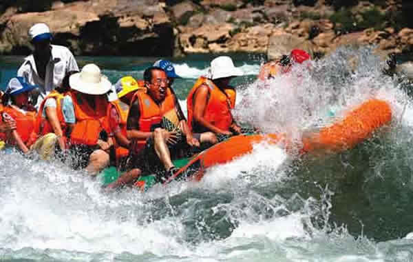 河水更為兇悍強(qiáng)勁,昂頭撤蹄,湍湍東去。一灘連一灘,一浪挽一浪。百里河流百里灘,百里流水百里浪。茅巖河水無(wú)情地撞擊著河中根基深厚的礁石,盡管撞擊得頭破血流,斷腸裂肺,粉身碎骨,依然無(wú)怨無(wú)悔,從不停歇地演繹著生命的壯觀。被撕碎的生命化成點(diǎn)點(diǎn)銀珠拋上天空,繼而又落回永不消逝的軀體上,織就了一幅生生不息的王母娘娘灑降甘露圖。而被河水沖撞了千百年仍然傲然屹立的礁石,撕破了河水剛剛要向人展示玉脂般的肌膚,又被洶涌而至的河水淹沒(méi),再次擊起滿天銀花。前進(jìn)與阻擋相搏發(fā)生的巨大轟鳴,在河谷里一次又一次的回響,在群山中一次又一次地震蕩。若乘坐皮筏或小舟在河上漂流,一種無(wú)以言狀的享受游走在每根神經(jīng)。人時(shí)而被軟若無(wú)骨的河水拋上浪尖,時(shí)而又被它牽扯著跌入峰谷。會(huì)不由自主地發(fā)出享受大自然賦予的刺激的無(wú)險(xiǎn)驚叫。尖叫聲與浪濤聲匯成了一支歡樂(lè)的樂(lè)章。