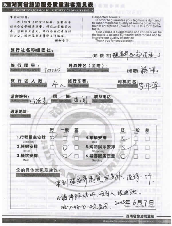 5月下旬,上海張女士一行四位貴賓與湖南西部(張家界)中國(guó)國(guó)際旅行社工作人員——龔玲取得聯(lián)系,經(jīng)過(guò)商談,雙方達(dá)成協(xié)議并簽訂旅游合同,于6月4日抵達(dá)張家界,開(kāi)始張家界之旅。此次行程是由我社優(yōu)秀導(dǎo)游——褚偉,負(fù)責(zé)旅游接待工作,褚導(dǎo)在旅游過(guò)程中講解詳細(xì),客人也很滿意,在意見(jiàn)表上寫(xiě)到:來(lái)到張家界感覺(jué)很意外,值得一行,小褚講解動(dòng)聽(tīng),吸引人,很幽默!同時(shí)也感謝張女士選擇湖南西部(張家界)中國(guó)國(guó)際旅行社,以及您對(duì)湖南西部國(guó)旅的信任與支持。我們會(huì)繼續(xù)努力,做好旅游接待工作。期待下一次與您的合作,祝您愉快!