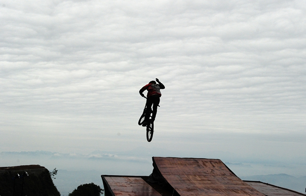 自行車(chē)運(yùn)動(dòng)包含了公路自行車(chē)和山地自行車(chē),而山地自行車(chē)又包含眾多種類(lèi),BMX小輪車(chē),攀爬車(chē), XC(越野山地車(chē)),AM(全山地車(chē)山地車(chē)),DH(山地速降)等。其中,DH屬于山地自行車(chē)運(yùn)動(dòng)中最重型車(chē)種,騎行最具挑戰(zhàn)性、觀賞性、技巧性。DH山地速降最典型的賽道是在山上,樹(shù)林中,天門(mén)山999級(jí)臺(tái)階速降騎行對(duì)于DH山地車(chē)速降來(lái)說(shuō)更具挑戰(zhàn)性。整條臺(tái)階沒(méi)有平坦路面,一路顛簸下山,中途沒(méi)有可調(diào)整的機(jī)會(huì),要求車(chē)手有極高的控車(chē)能力,天梯平均陡度39度以上,僅是站立在臺(tái)階上就已經(jīng)感覺(jué)一覽眾山小了,站在自行車(chē)上更是陡峭,天梯一路筆直下山,加上其坡度,車(chē)手的速度可想而知,也更是車(chē)手對(duì)車(chē)子的控制力的一個(gè)新挑戰(zhàn)。賽道中還加設(shè)了跳臺(tái),車(chē)手在應(yīng)付如此高難度臺(tái)階路段同時(shí),還要進(jìn)行跳躍,更是難上加難。天門(mén)山天梯速降賽被業(yè)界譽(yù)為“世界上難度最大,對(duì)選手技術(shù)要求最高的速降賽”,其極高的難度和無(wú)與倫比的觀賞性成為世界范圍內(nèi)最精彩最具挑戰(zhàn)性的自行車(chē)速降比賽之一。
