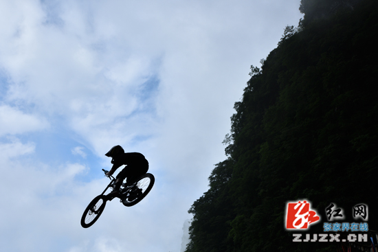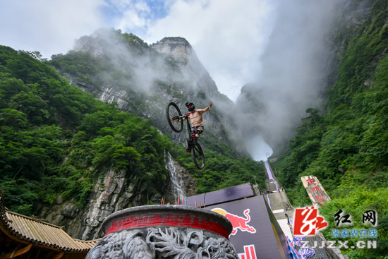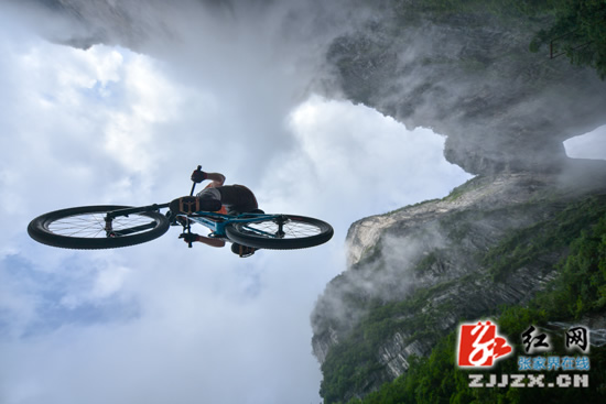 張家界天門山天梯速降賽即將拉開帷幕,7月14日,來自不同國家的14名選手齊聚天門山999級(jí)臺(tái)階進(jìn)行適應(yīng)場地訓(xùn)練。選手們?cè)诳罩凶龀龈鞣N翻滾特技動(dòng)作,引來游人尖叫不斷。