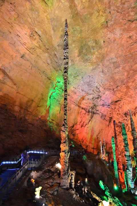 跨過(guò)中國(guó)游覽洞穴中跨度最大的石拱橋天仙橋,便進(jìn)入黃龍洞第三層天柱街了。天柱街是天上的街市,是神仙做生意的地方。天柱街以繁華似錦、春意盎然的“天上街市”為中心,西街花果山石柱石花重重疊疊,東街“天堂宮” 穹形洞頂高大幽深。順著長(zhǎng)長(zhǎng)的崩塌的斜坡往上看,兩根大石柱及壁流石被地下水溶蝕形成了奇妙的空洞,因從不同的地方可以敲出奇妙而悅耳的音符得名“石琴山”。一九八四年,中央電視臺(tái)拍攝電視專題片《地下明珠——黃龍洞》的時(shí)候,就是在這兩根石柱上敲擊出了一曲完整的《賣報(bào)歌》。
