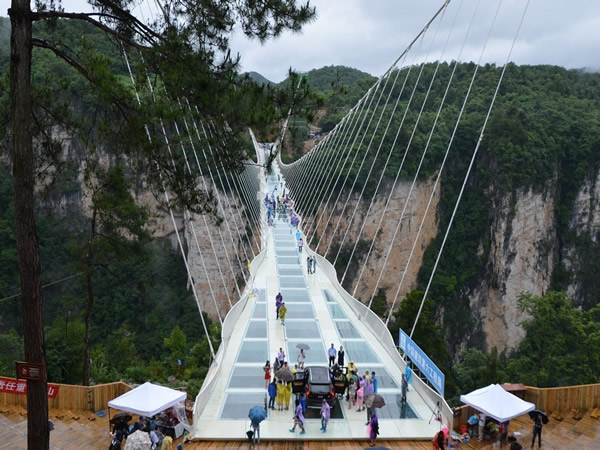 上 午:早餐后07:30至08:00 準(zhǔn)時(shí)統(tǒng)一集合乘車(chē)赴“小九寨溝”之美譽(yù)的張家界大峽谷景區(qū)。(車(chē)程約60分鐘)【張家界大峽谷+玻璃橋B線】(門(mén)票已含),(已含首道門(mén)票,含游船費(fèi),游覽時(shí)間約3個(gè)小時(shí)),零距離接觸張家界“奇峰三千,秀水八百”的神奇瑰麗。觀天仙水瀑布、蝴蝶泉瀑布、竹仙泉、翠潭攬瀑;行于一線天、天梯棧道、石壁裂縫、石上森林;探怪謎洞、佛手遮天、爛船巖千古流傳的未解之謎;谷中猴群歡躍,百鳥(niǎo)爭(zhēng)鳴,湖水清澈、群山倒蘸 ,鴛鴦戲水、空氣清新、絕無(wú)僅有。形態(tài)各異的瀑布群,把生命之源傾瀉得淋漓盡致;隨海拔變化的植物帶,將四季更替演繹得如詩(shī)如歌;數(shù)條彩虹,百米梭板,千年風(fēng)情,萬(wàn)米長(zhǎng)廊,把峽谷內(nèi)裝扮得如畫(huà)似錦。體驗(yàn)世界最高最長(zhǎng)首座斜拉式高山峽谷玻璃橋【云天渡】,漫步天上人間、輕吻藍(lán)天白云、帶上你的心靈從這頭走到那頭、走過(guò)青絲到白發(fā)!挑戰(zhàn)極限,戰(zhàn)勝自我(上橋游覽時(shí)間為20-30分鐘);(玻璃橋游覽注意事項(xiàng):1、遇大風(fēng)、暴雨等極端惡劣天氣,玻璃橋有可能關(guān)閉,關(guān)閉不能通行時(shí)不退任何費(fèi)用;2、除錢(qián)包和帶有手機(jī)套的手機(jī)外,任何物品不得帶上橋;3、凡有心臟病、高血壓、恐高癥及醉酒和其他身體不適宜游覽的,請(qǐng)勿上橋;4、穿高跟鞋的游客不允許上橋;5、不得在橋上追逐、打鬧,拋物,不得倚靠橋上欄桿,以防身體傾斜,發(fā)生意外。6、游客在游覽過(guò)程中請(qǐng)聽(tīng)從景區(qū)工作人員管理)!
