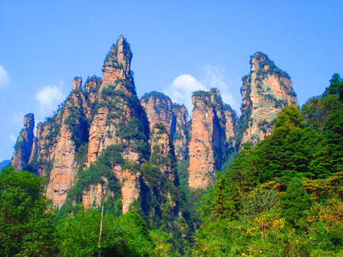 下 午:漫步游覽“中國最美麗的大峽谷”——【金鞭溪】:金鞭溪是天然形成的美麗溪流,因金鞭巖而得名,溪谷植被繁茂,溪水四季清澈,被稱為“山水畫廊”、“人間仙境”。全長7.5公里,步行約2.5小時。沿途游覽金鞭巖、神鷹護鞭、劈山救母、醉羅漢、文星巖、紫草潭、千里相會、水繞四門、觀音送子、師徒取經(jīng)、長壽泉、蠟燭峰、雙龜探溪、秀才藏書等著名景點;乘環(huán)保車至武陵源門票站。【備注:自駕車的司機只能游覽金鞭溪上游,然后返回開車到武陵源】